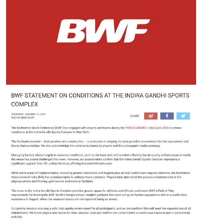 针对丹麦选手米娅批评场馆不太卫生。印度羽协今天回应称:“米娅的言论是在更广泛的背景下,针对整体比赛条件和个人健康敏感性发表的,并非针对印度公开赛的比赛场馆本身。她也明确表示,比赛场馆本身维护得非常好。正如她在谈到热身区时提到的,需要注意的是,她指的是 KD Jadhav 体育馆,该场馆作为训练场使用,而非主比赛场馆。作为一名对灰尘和环境因素较为敏感的运动员,她只是分享了个人视角,说明有时环境条件可能会影响她的健康。主比赛场馆一直保持清洁,无灰尘、无鸽子,且多位运动员对场