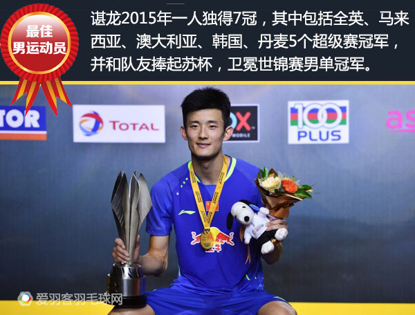 2015年的羽坛,可是说是“谌龙年”,世界排名第一的他,在今年一人独得7冠,其中包括全英、马来西亚、澳大利亚、韩国、丹麦5个超级赛冠军,并和队友共同捧起了苏迪曼杯。在世锦赛决赛,更是2比0横扫李宗伟,成功卫冕。在年底的世界排名中,谌龙的积分首次突破10万大关,成为羽坛历史上第7位进入“10万俱乐部”的成员,在世界羽联年度奖项的评选中,谌龙更是当之无愧获得年度最佳男运动员称号。