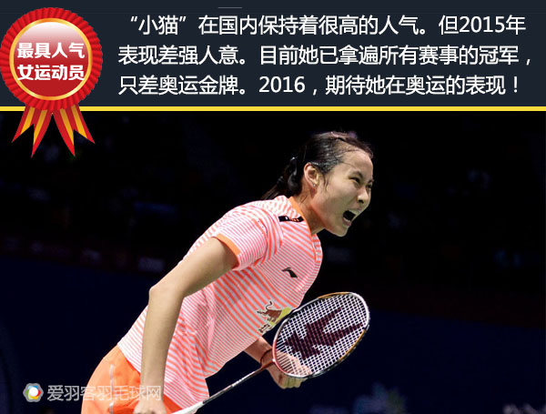 王仪涵虽然现在已经27岁,但在国内还是保持着很高的人气,球迷们喜欢称呼她“小猫”。虽然2015年王仪涵表现差强人意,仅夺得中华台北赛冠军,而且年终总决赛不敌奥原希望,但球迷们看到了她的努力与坚持!王仪涵目前几乎已经拿遍了所有赛事的冠军:世锦赛、亚运会、超级赛总决赛,以及各种团体赛和超级系列赛冠军,只差一枚奥运金牌,她便可以实现女单历史上首个“大满贯”。2016,期待小猫在里约奥运的表现!