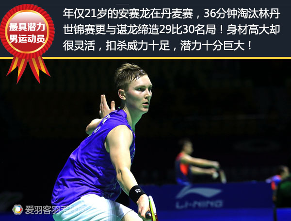 年仅21岁的安赛龙,成名于2010年墨西哥世界青年锦标赛。当时,他击败黄宇翔在内的多名亚洲好手夺冠,成为首位获得世界青年锦标赛男单冠军的欧洲选手。在2015年丹麦赛上,安赛龙仅用36分钟就淘汰了“全满贯”林丹,林丹两局竟然只得了15分!世锦赛,更是与谌龙缔造了29比30的名局!虽然年终总决赛不敌桃田贤斗,但放眼当今羽坛,从未出现过安赛龙这般身高,却保持灵活不呆滞的球风。他年轻力壮、加速快、防守范围大而顽强,扣杀威力十足,可以说安赛龙的增长潜力十分巨大!