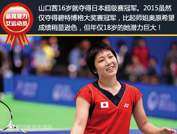 山口茜出生于1997年,身高1米56,体重55公斤,身材怎么看也不像是个专业运动员。但她在2013年日本超级赛,连胜7场,以16岁3个月的年龄,成为世界羽联超级系列赛中最年轻的单打冠军。2015年,18岁的山口茜夺得了碧特博格大奖赛女单冠军,虽然比起1995年出生的奥原希望一站冠军、一站亚军、六站进入前八名的成绩稍显逊色,但年仅18岁的山口茜在未来的表现值得期待。