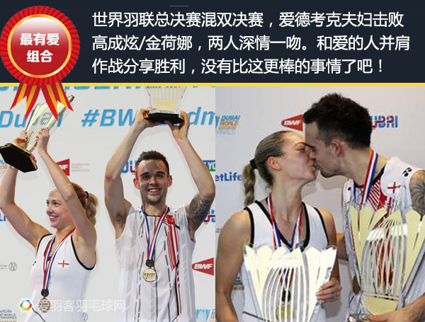 想必看过世界羽联总决赛小伙伴们,一定忘不了混双决赛,爱德考克夫妇击败高成炫/金荷娜后,两人深情的一吻。和爱的人并肩作战并分享胜利,没有比这更棒的事情了吧!所以,经过爱羽客编辑们讨论决定,将“年度最有爱组合”的奖项颁给克里斯·爱德考克和加布里·爱德考克。加布里看克里斯的眼神,不由的让小编想起了《大话西游》里,紫霞仙子看至尊宝的眼神,真的满满全是爱啊!有木有!