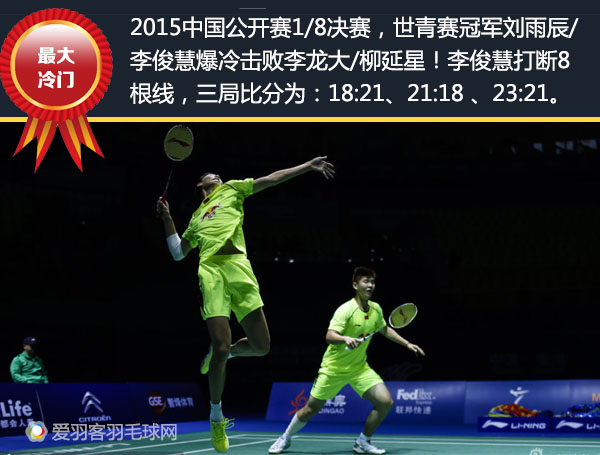 在2015中国公开赛男双1/8决赛中,世青赛冠军刘雨辰/李俊慧击败夺冠热门李龙大/柳延星,爆出最大冷门!李俊慧这场比赛打断8根线,关键是他总在关键分上打断拍线,而且一断线就得分,三局比分分别为18比21、21比18、23比21。
