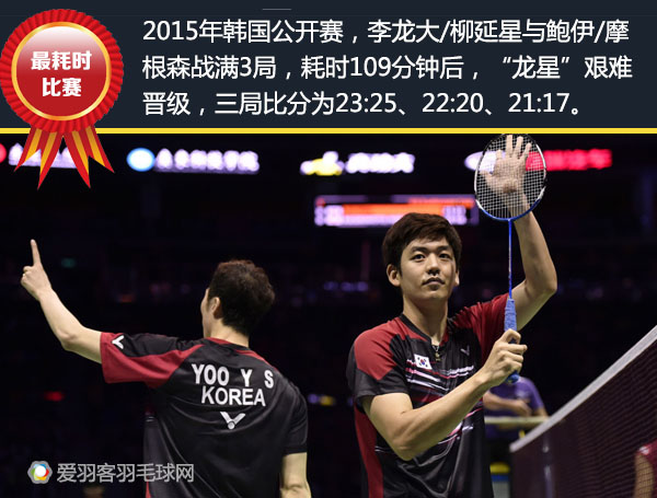 在2015年韩国公开赛上产生了2015年耗时最长的比赛,并且是在节奏最快的男双项目中产生。李龙大/柳延星与鲍伊/摩根森苦战3局,耗时109分钟后,“龙星”艰难晋级,三局比分为23比25、22比20、21比17。