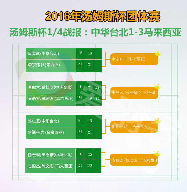 爱羽客羽毛球网5月19日讯,今天的第一阶段汤姆斯杯1/4决赛当中,李宗伟所带领的马来西亚3-1击败了中华台北队,率先晋级4强。印尼3-1战胜中国香港,也晋级4强。