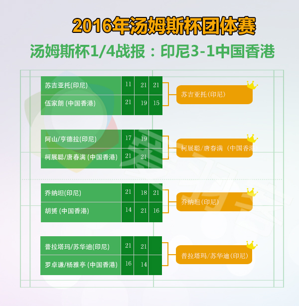 而在另一场印尼与中国香港的汤姆斯杯1/4决赛中,印尼同样是以3-1的比分击败了中国香港队进入四强。