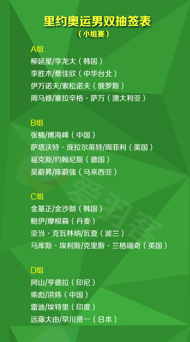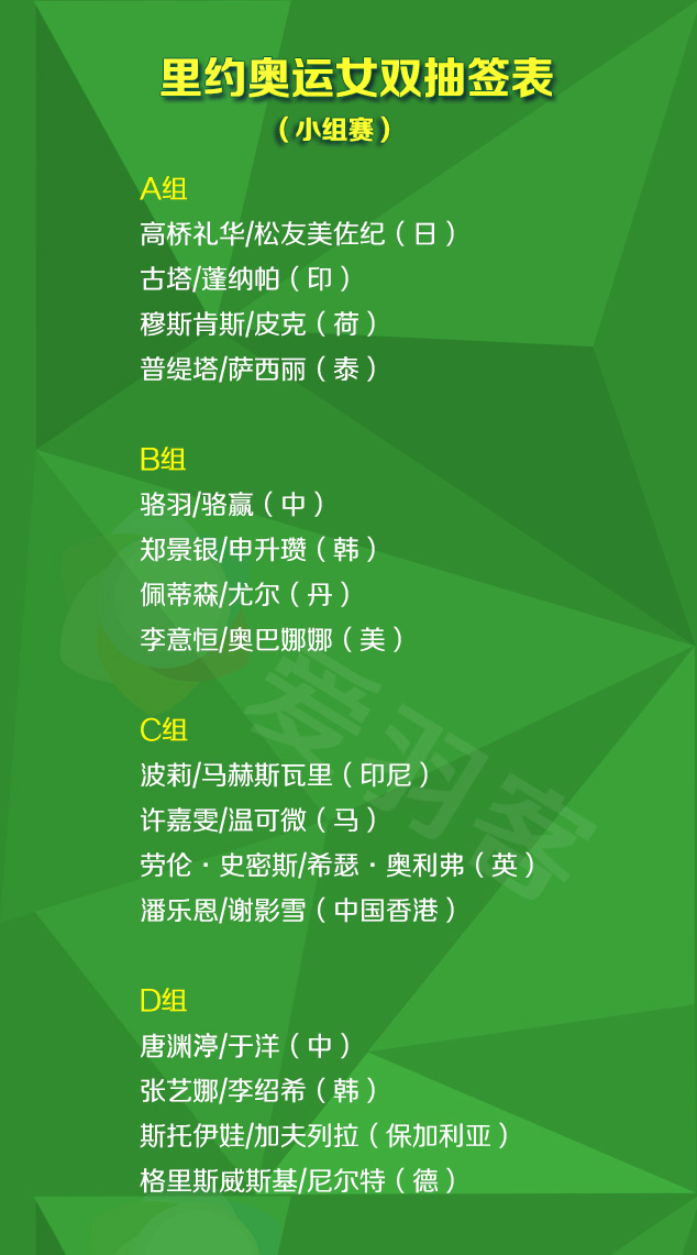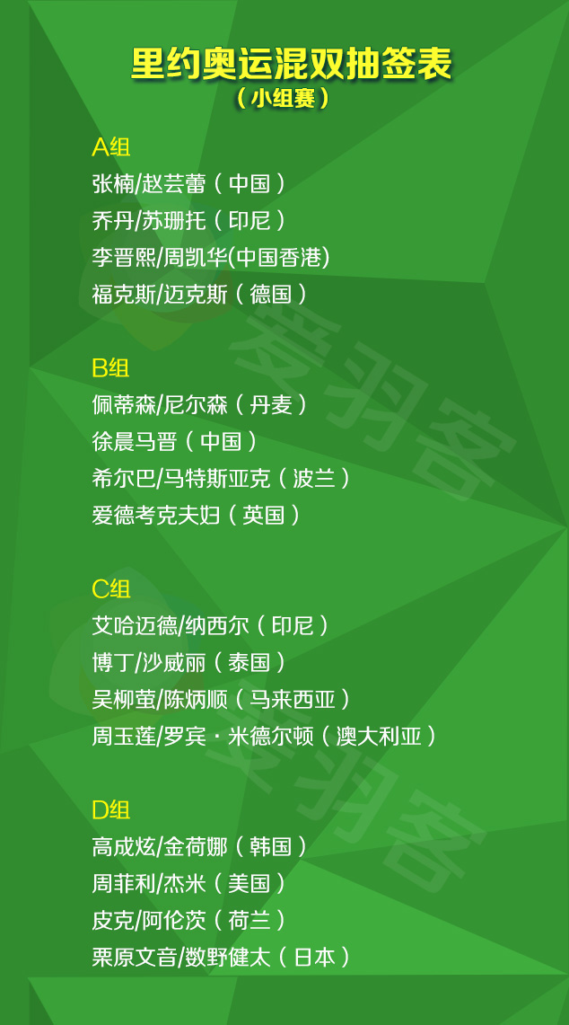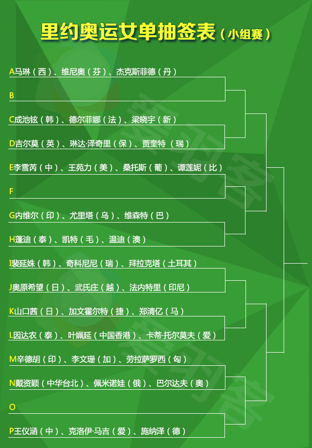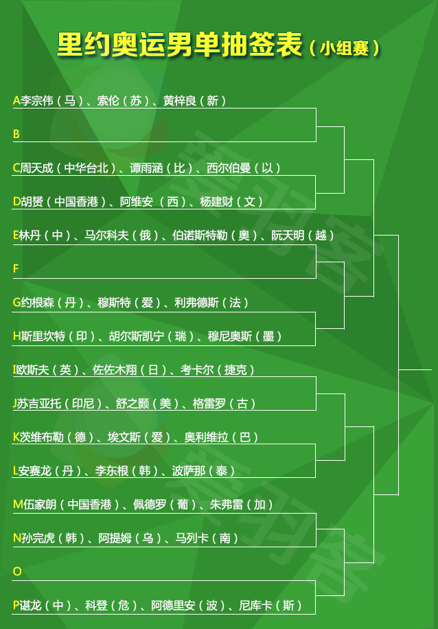 今晚,2016年里约奥运会羽毛球比赛抽签仪式已经结束,结果如下: