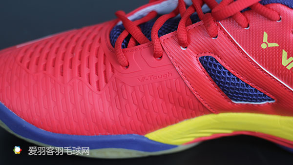 注意内侧有一个单词V-Tough,这是威克多的一个独家技术,原本鞋头处的橡胶材料就已经十分耐磨,现在再在表面上加上许多梯形的凸起,可以进一步增强球鞋内侧的抗磨程度。