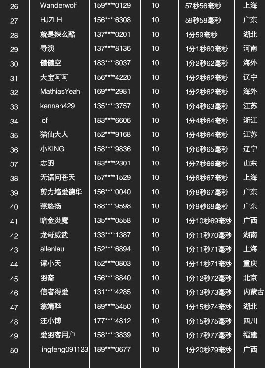 “看嘴巴猜羽球明星,50份好礼任性送!”活动,感谢各位球友们的大力支持,截止到8月1日下午两点,活动已经全面结束了。按照活动规则,恭喜以下50位幸运用户分别获得爱羽客商城的100元充值码一个。